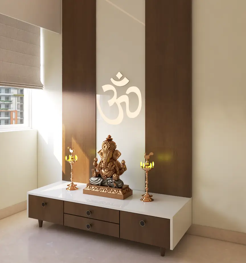 For those with extra space, a full pooja room offers privacy and focus. You can add stone walls, bells, wooden doors, soft lighting, or traditional carvings for an authentic temple vibe. This setup works beautifully for joint families or anyone who prefers a complete, serene prayer space.